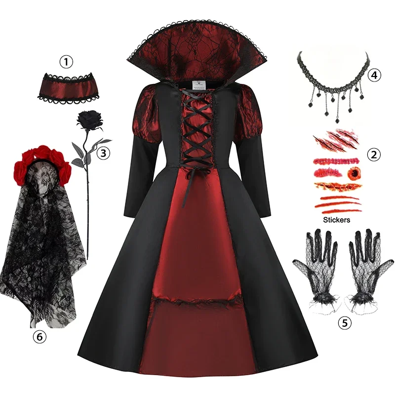 👻 Vestito Sposa VAMPIRO per Bambini - Maniche a Sbuffo Gotico con Fiocchi, Per Halloween e Feste!