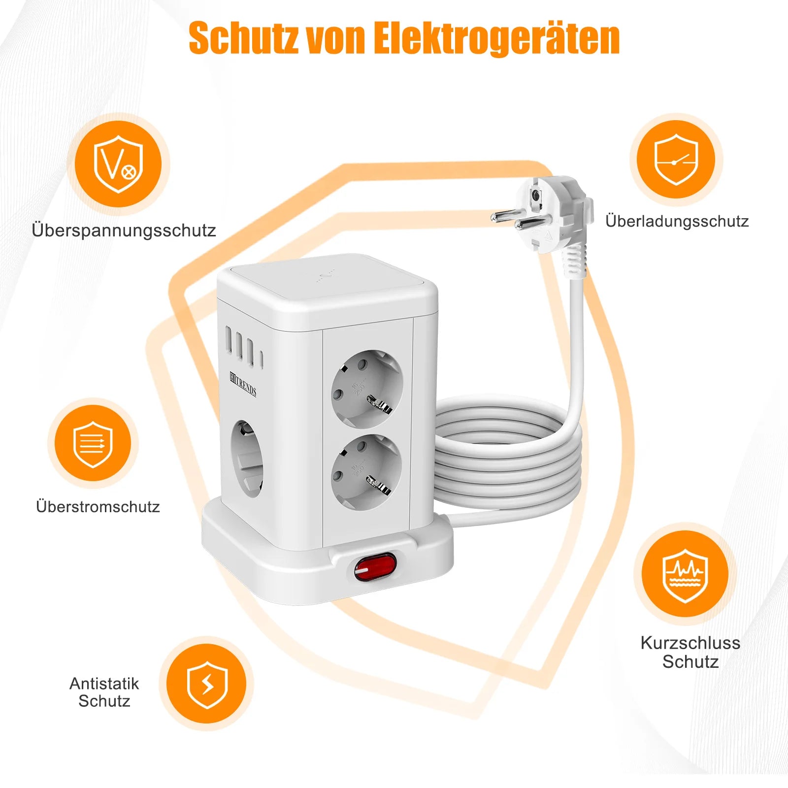 Rivoluziona la tua presa di corrente! Questa ciabatta verticale combina 11 prese UE standard, una stazione di ricarica wireless da 15W e 4 porte USB cablate per alimentare tutti i tuoi dispositivi contemporaneamente. Design compatto e sicuro con interruttore di protezione, perfetto per casa e ufficio.