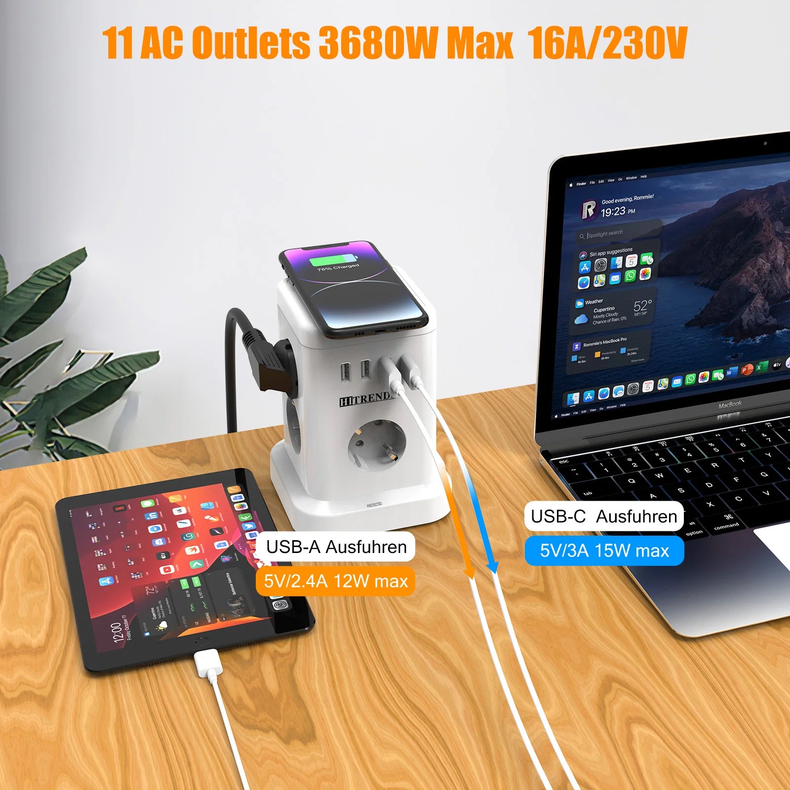 🔌 11 PRESE UE + RICARICA WIRELESS: Collega fino a 11 dispositivi. La parte superiore integra un piano di ricarica wireless Qi da 15W per smartphone compatibili.