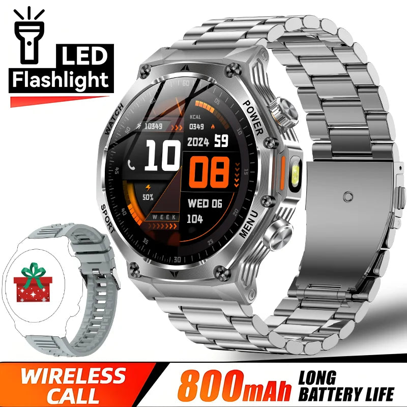 Il compagno perfetto per le tue avventure outdoor. Questo smartwatch da uomo del 2026 unisce robustezza, autonomia record e funzionalità smart in un design sportivo ed elegante. Con batteria da 800mAh, schermo AMOLED da 1.8", torcia LED integrata e resistenza all'acqua, è l'ideale per chi vive all'aria aperta senza rinunciare alla tecnologia.