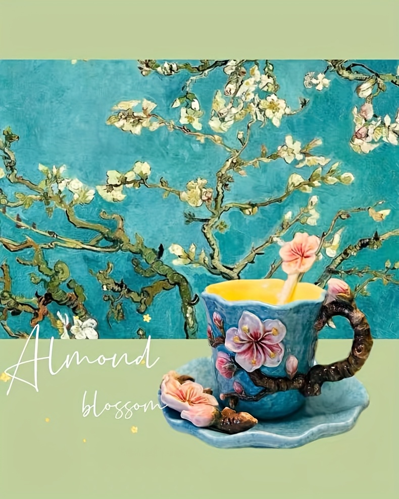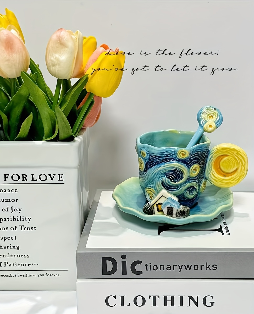 Set Tazza Ceramica Van Gogh Dipinto a Mano, Caffè con Soucer e Cucchiaio, Regalo Elegante